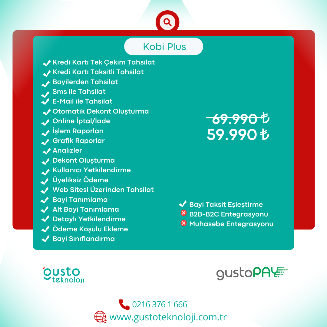 GustoPay KOBİ Plus, işletmenizin tüm ödeme süreçlerini daha hızlı, güvenli ve verimli hale getiren gelişmiş bir ödeme çözümüdür. Özelleştirilebilir özellikleri ve kapsamlı entegrasyon seçenekleri ile her ölçekten işletmeye uyum sağlar. Gelişmiş raporlama ve analiz araçları ile finansal yönetiminizi optimize edin, işinizi bir üst seviyeye taşıyın. GustoPay KOBİ Plus ile dijital dünyada bir adım önde olun.